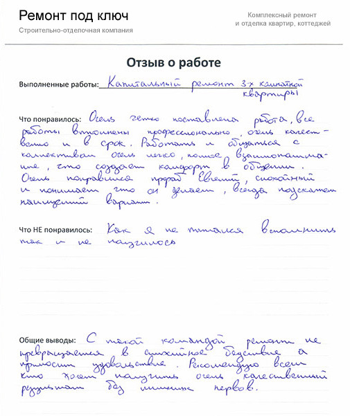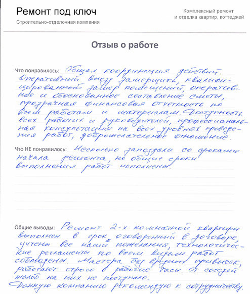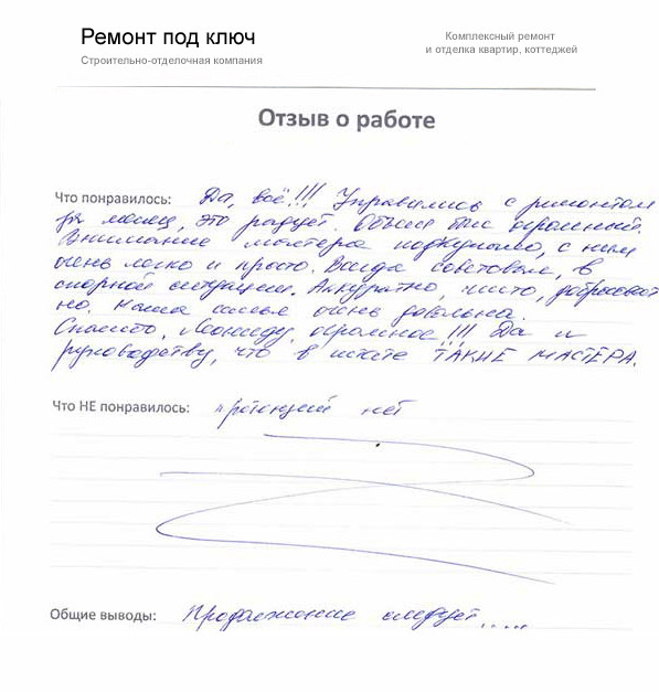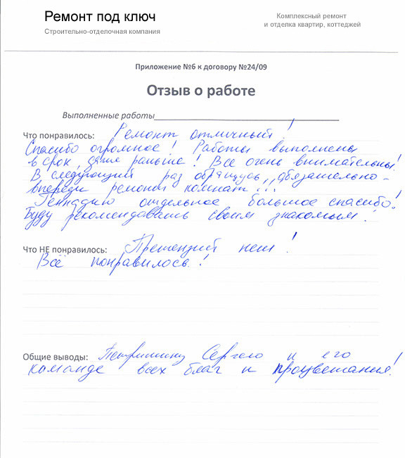 Я выбирала фирму для ремонта в интернете, смотрела сайты и рекомендации. По цене выбрала "Ремонт под ключ" и не разочаровалась. Хочу порекомендовать людям, которые уже приступили к ремонту своих квартир или офисов, или только ищут исполнителей, обратиться в эту компанию. Благодарна за теплый прием, внимательное отношение и профессионализм.